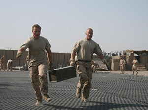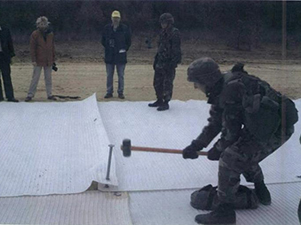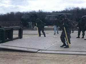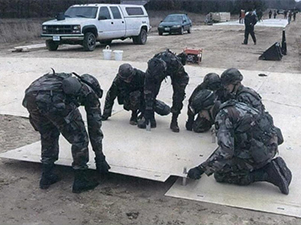 | 美军在试验聚氨酯编织物软质起落坪 | 美军在欧洲使用的机械拼装硬质起落坪 |